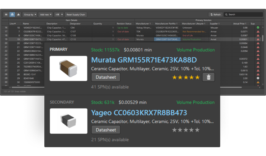 Przegląd kosztów oraz dostępność komponentów BOM w jednym miejscu. Altium Designer łączy się z setkami globalnych dostawców dzięki danym z Octopart i IHS Markit, zapewniając zawsze aktualne informacje o cenach, dostępności i cyklu życia komponentów.
