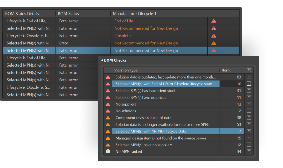 ActiveBOM wykonuje kompleksowy zestaw kontroli, aby automatycznie weryfikować specyfikacje, znajdować zduplikowane parametry i oznaczenia, identyfikować części bez dostawców i wiele więcej. Problemy są wyświetlane bezpośrednio w BOM, co ułatwia ich identyfikację i rozwiązanie, z możliwością nadania priorytetu dla każdego z nich.