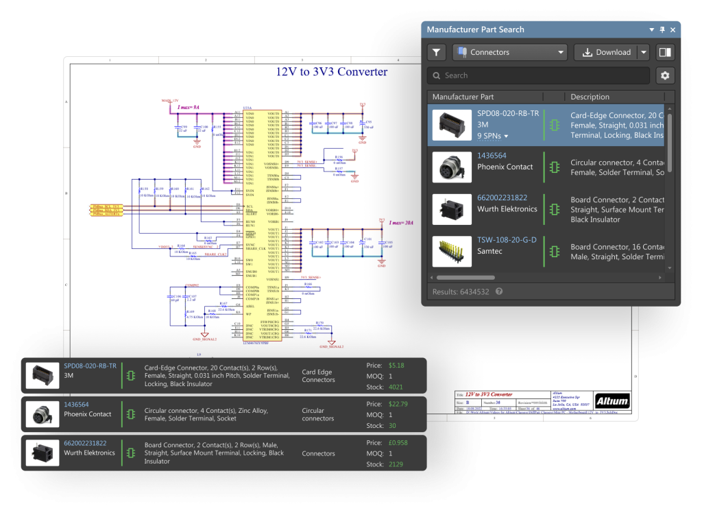 Wybór komponentów do projektowanego urządzenia bezpośrednio w Altium Designer, bez potrzeby korzystania z zewnętrznych wyszukiwarek części.