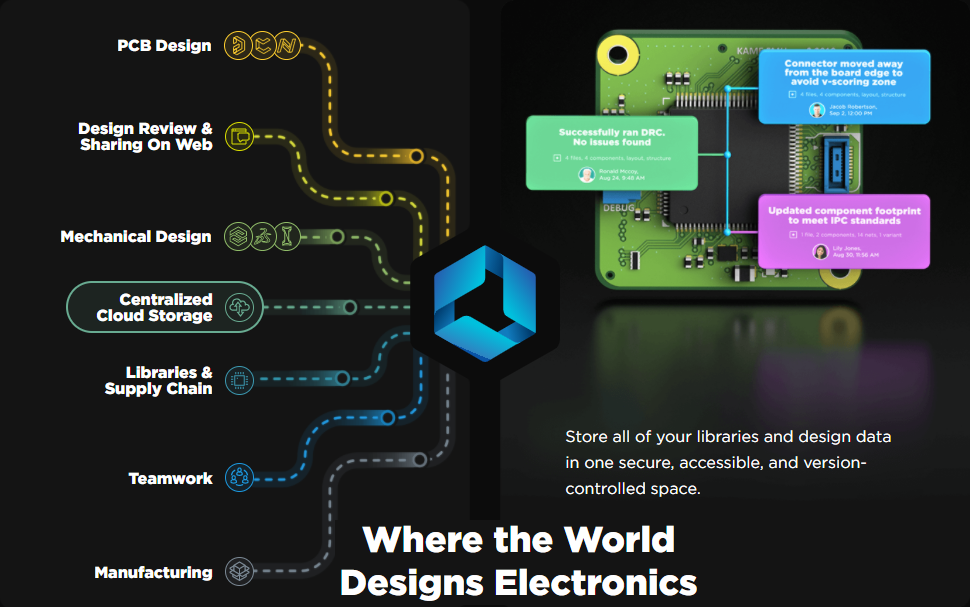 Przechowywane są tam wszystkie istotne dane: komponenty, symbole, footprinty, modele symulacyjne, szablony, projekty oraz dane wyjściowe, w tym dokumentacja produkcyjna i montażowa. Projekty mogą być przeglądane, komentowane i analizowane z pełną historią zmian.